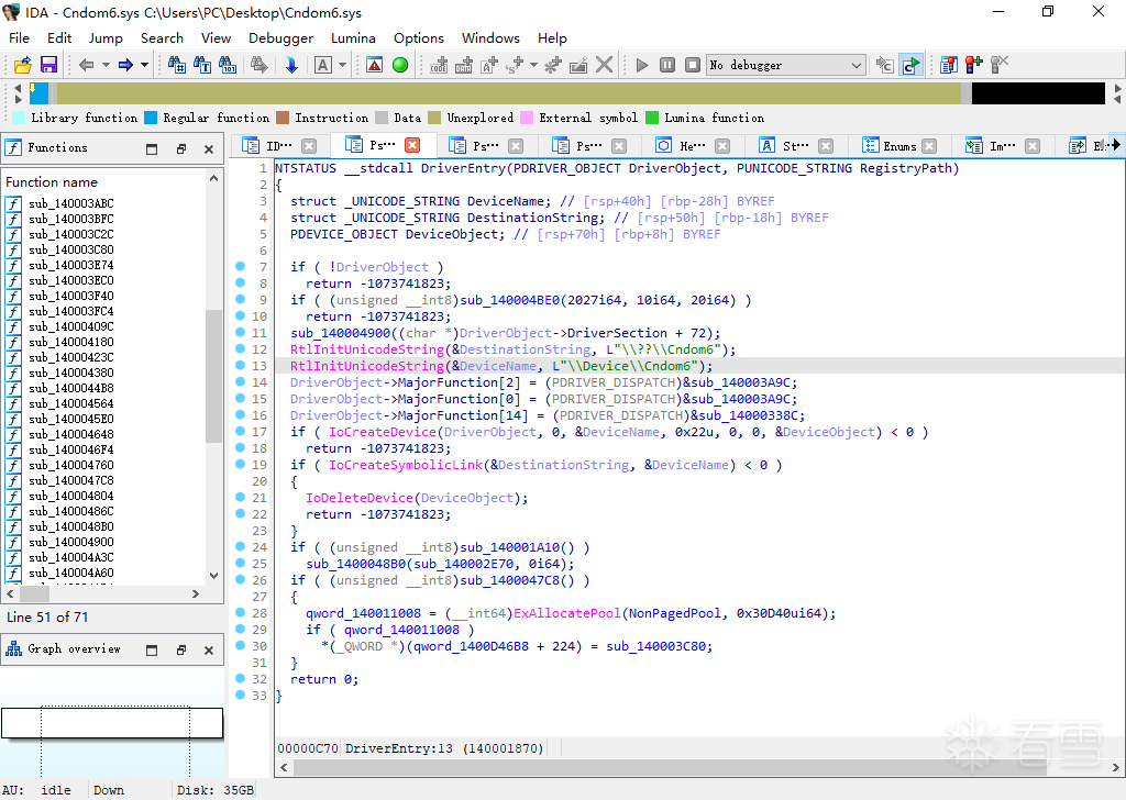 首先,进入DriverEntry,驱动程序调用IoCreateDevice创建一个名为"\Device\Cndom6"的设备对象,接着调用IoCreateSymbolicLink建立符号链接"\??\Cndom6",这样用户态应用程序就可以通过以上设备对象或链接名称访问该驱动设备。