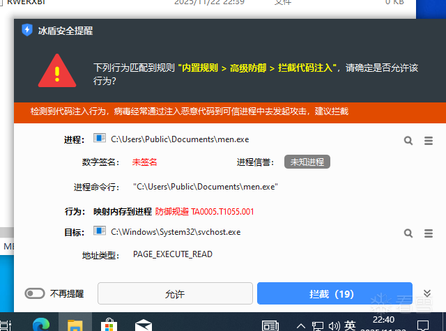 同时,观察到men.exe会尝试注入可读可执行内存至svchost.exe进程中,如下图所示:
