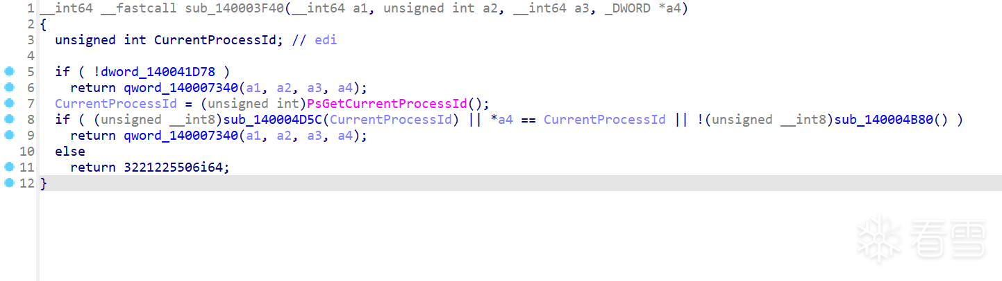 同理,以NtOpenProcess为例,查找qword_140007340的交叉引用,找到针对NtOpenProcess API的Hook函数sub_140003F40,用于执行进程句柄保护,功能开关标志位为dword_140041D78,如下图所示: