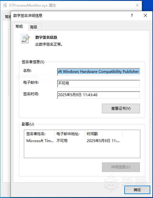该驱动通过了WHQL认证,具有"Safetica Technologies s.r.o."与"Microsoft Windows Hardware Compatibility Publisher"颁发的数字签名,签名时间为2025年5月9日 11:43:46,相当新鲜,如下图所示: