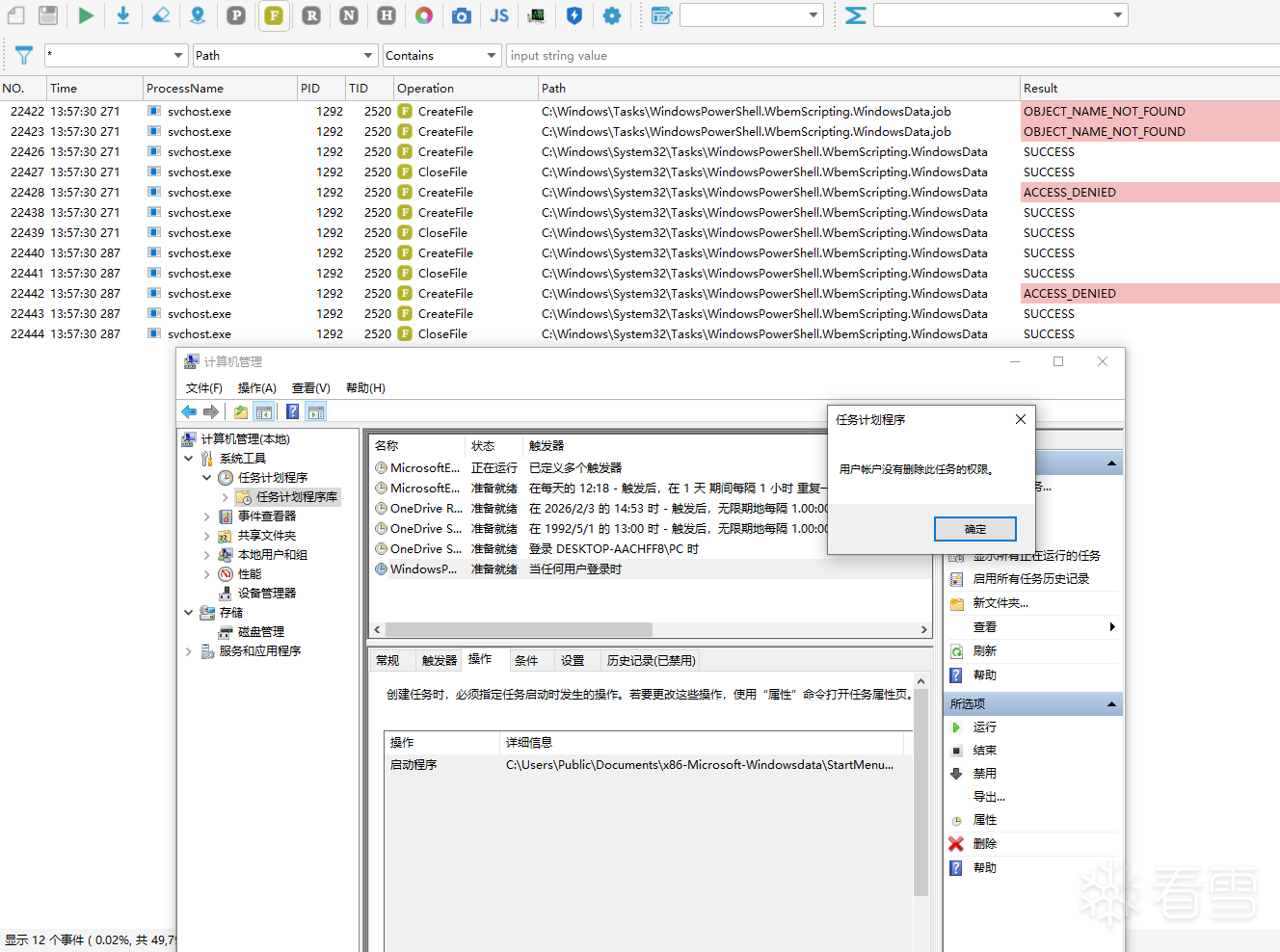 具体原因为,在删除计划任务时,实际执行者svchost.exe在删除该计划任务xml文件时抛出拒绝访问错误(ACCESS_DENIED),如下图所示: