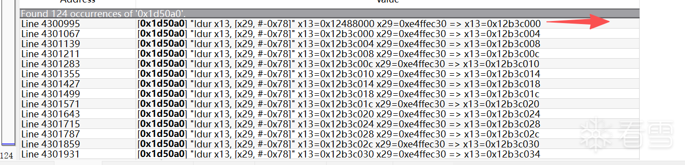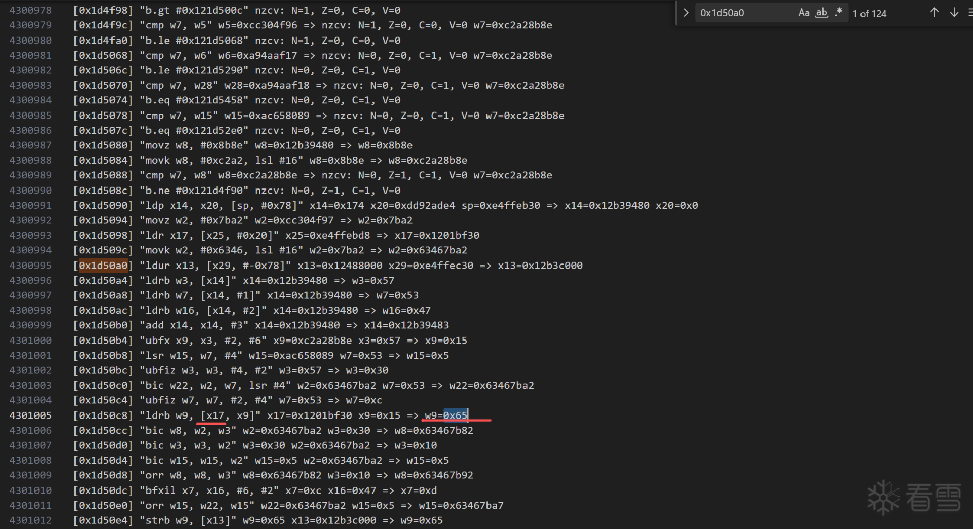 此时保存结果的内存值为 x0=0x12b3c000,向上查找它的写入来源,发现偏移 0x1d50a0存在可疑访问 :搜索这个偏移,发现这个地址执行了124次,每次的地址都是加4,编码后的数据正好是 124*4=496