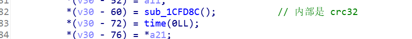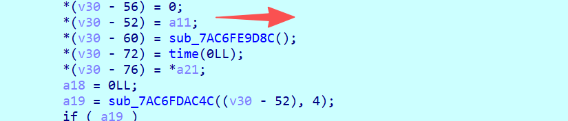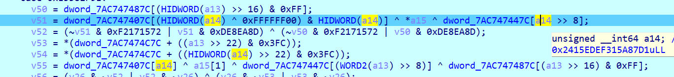 查看 0x1e34c8 处的伪代码,a14 就是上面的 Result1和 Result2的组合:高4字节=Result1,低4字节=Result2 (每次调试数据不同,导致和trace数据不同),这里 Result1 和 Result2 是作为 dword_7AC747447C 的索引