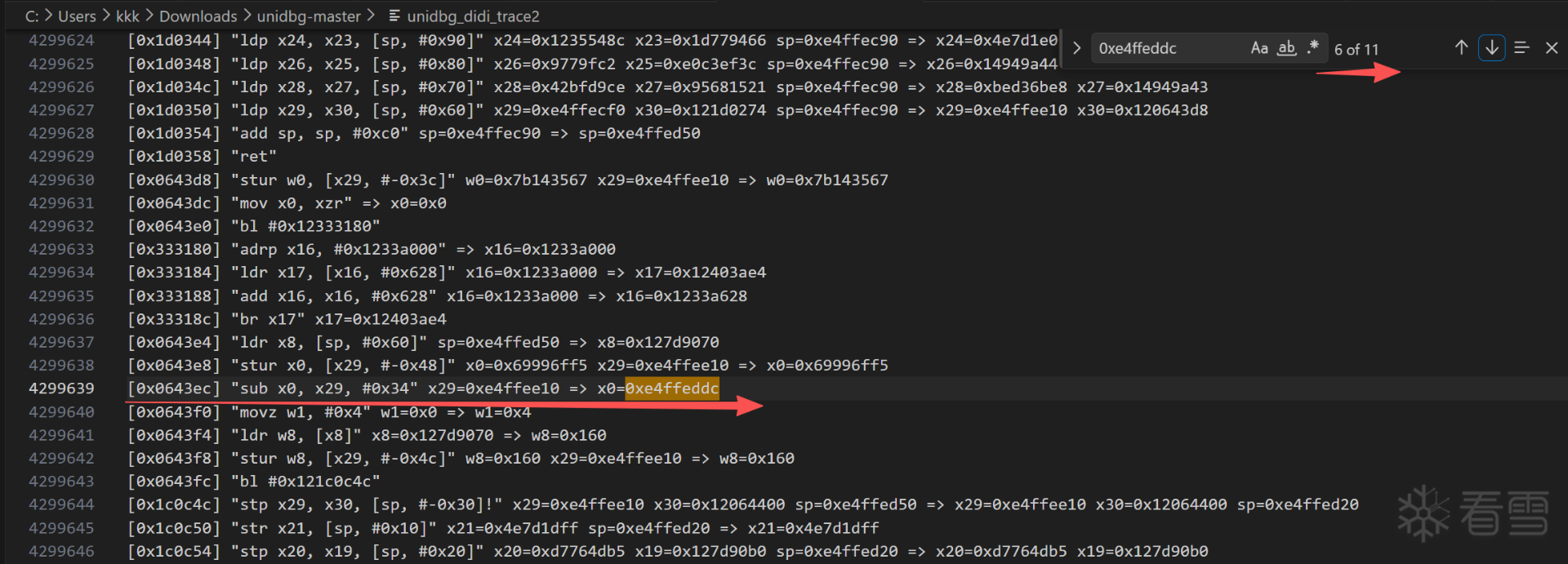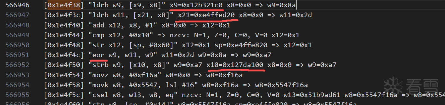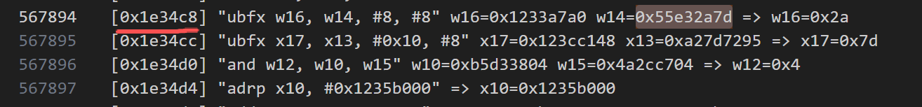 往下看 567703 行,取出了上述的 Result1 和 Result2,直接搜索这个0x55e32a7d,发现在 567894行执行了 0x1e34c8