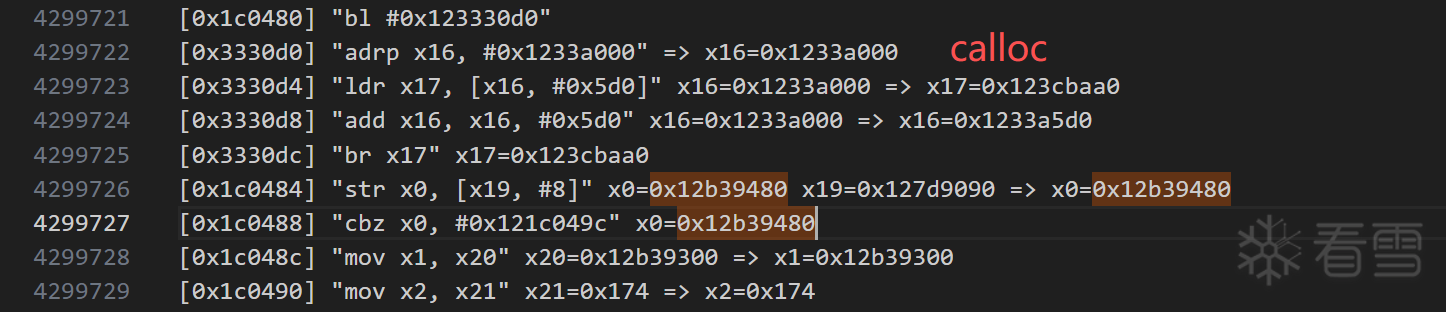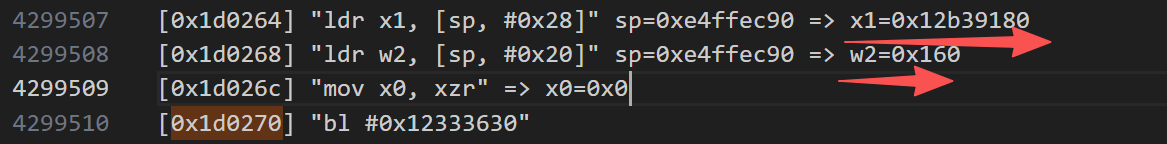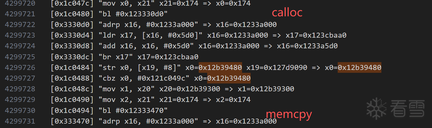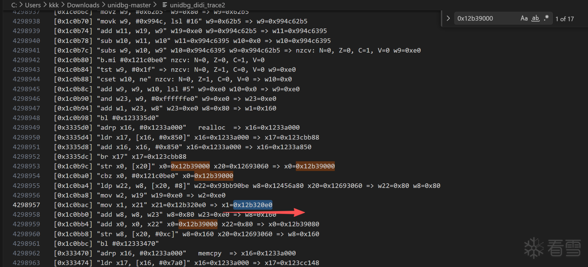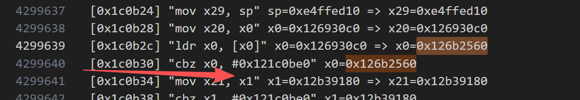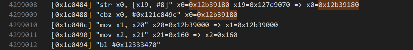 继续找 realloc 时的 x0 地址:在执行到 0x1c0b30 的时候找到了 内存0x126b2560 (第6次执行到 0x1c0b30)