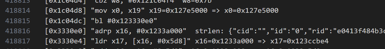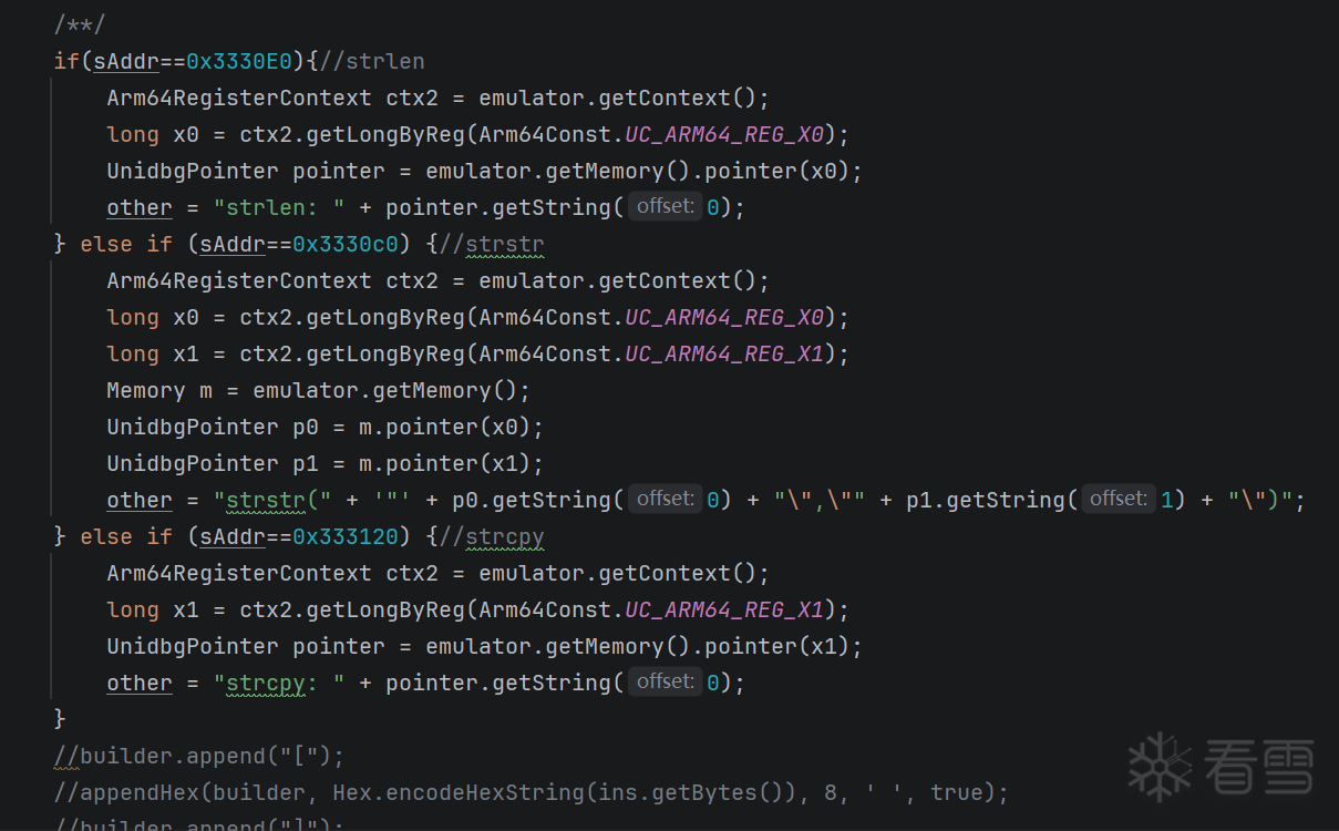 需要修改 unidbg trace 的格式,把一些字符串打印出来,比如 strlen 、strstr、strcpy 这个字符串操作函数。