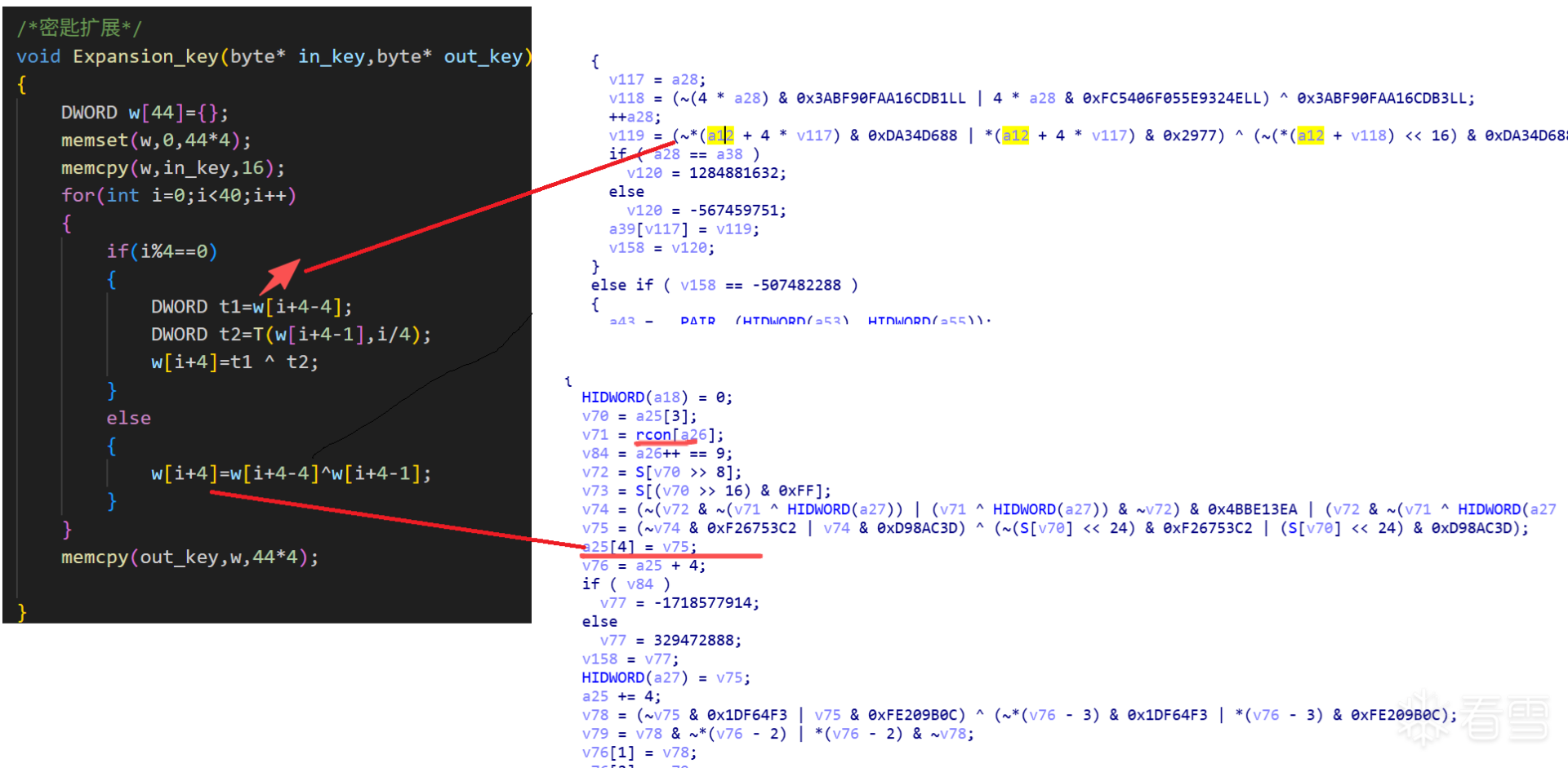 查找 aes key: 查找 rcon 的引用,其在 0x1e10b0 函数中被引用,在其中找对应的密钥扩展代码,发现如下特征,可以猜测 a12参数就是 原始aes key,a25(参数 x21+0x10) 保存的就是扩展后的key ,而 (这种可以直接看每个参数,一般都会把 key 以参数的方式进行传递)