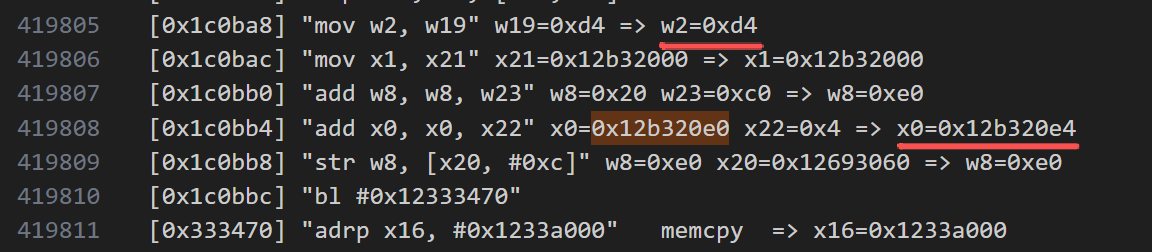 跟踪这个地址 0x12b320e4,它没有其它引用,说明它是通过 base+offset 的方式进行访问,所以搜索 0x12b320e0 或 0x12b32000,分析后发现只有 0x12b320e0 符合base条件,但 0x12b320e0 后续没有作为base 去访问,还是通过复制的方式给了内存 0x12b321c0