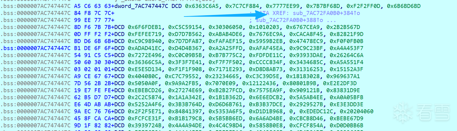 查看 dword_7AC747447C 数据,搜索了一下是 AES 的 T1