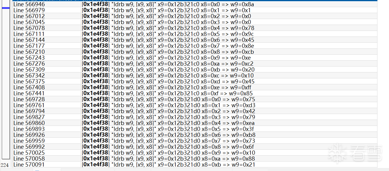 跟踪 0x12b321c0,出现了122次,很可能就是在做加密,找到了它是在偏移 0x1e4f38 处被索引,搜索 0x1e4f38,共有 224 次,就是: