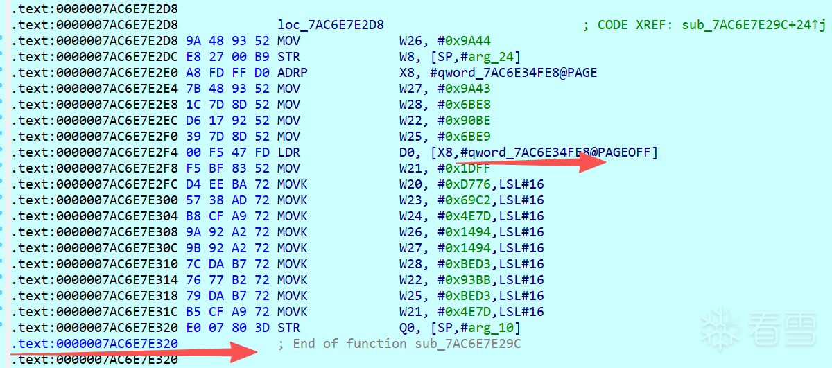 方式1:上图的 x9 就是根据原始数据计算的table 偏移,能够向上找到 偏移 0x1d50b4 处的 x9, 最后就是偏移 0x1d50a4 处的 w9 ,很明显x14 就是原数据