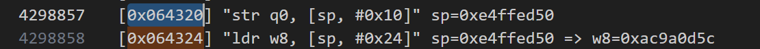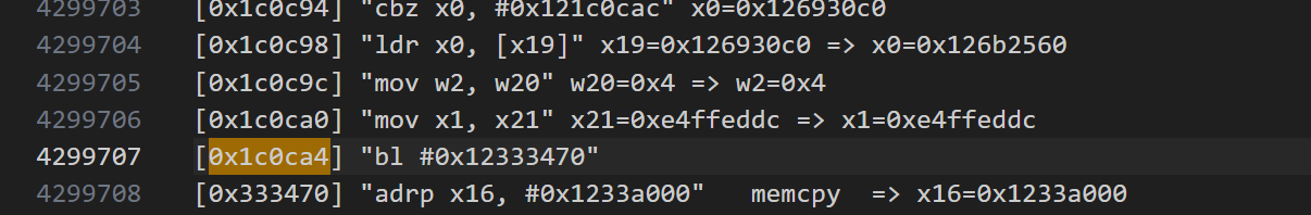 对应的函数是偏移 0x64324,但这个函数被调用了很多次,包括自身嵌套调用,不管了,重新运行,给偏移 0x64324 下断,让它第一次中断在这里,此时 a11 就是标识,查看此时的调用源头,根据trace 判断是它不是通过 BR、BL 调用的,而是从0x64320 执行下来的: