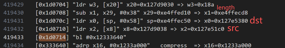 查看代码,中间确实是在 0x1d0714处调用了压缩函数,但代码是在 419433 行被调用的啊....