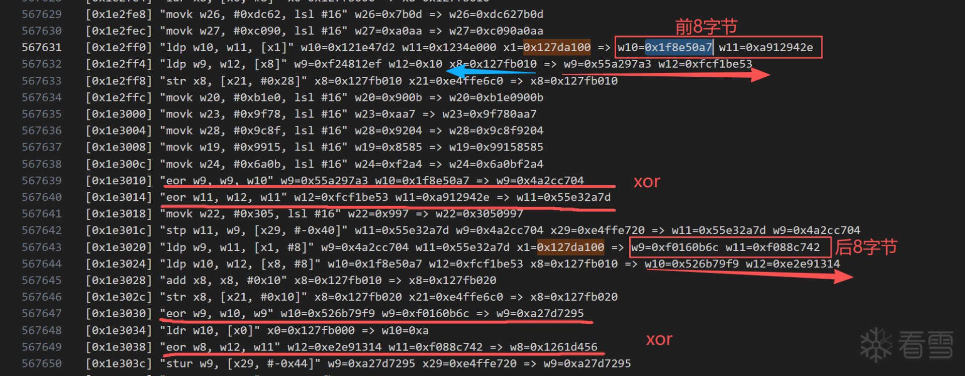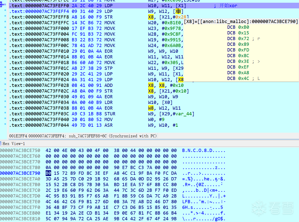 现在回到上面 <加密2>的的xor 上来,内存0x127fb010 中的 x8 保存的就是刚刚AES扩展后的key,而x11保存的是<加密1> xor的数据