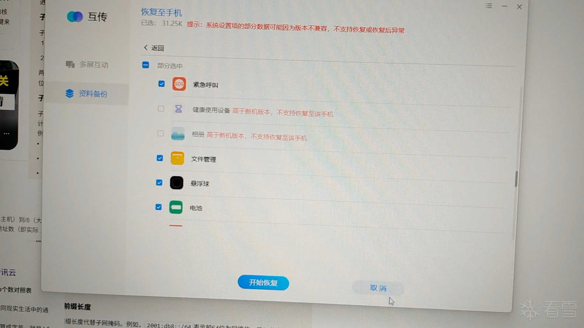 手机usb有线连接电脑后,使用自动弹出的虚拟光驱安装“互传”。安装成功后连接手机和“互传”,提示成功后开始全机备份。备份结束后在手机设置操作“清除数据并恢复出厂设置”。意外产生系统版本降级,继续连接“互传”恢复备份时提示“新机版本过低 无法恢复”。