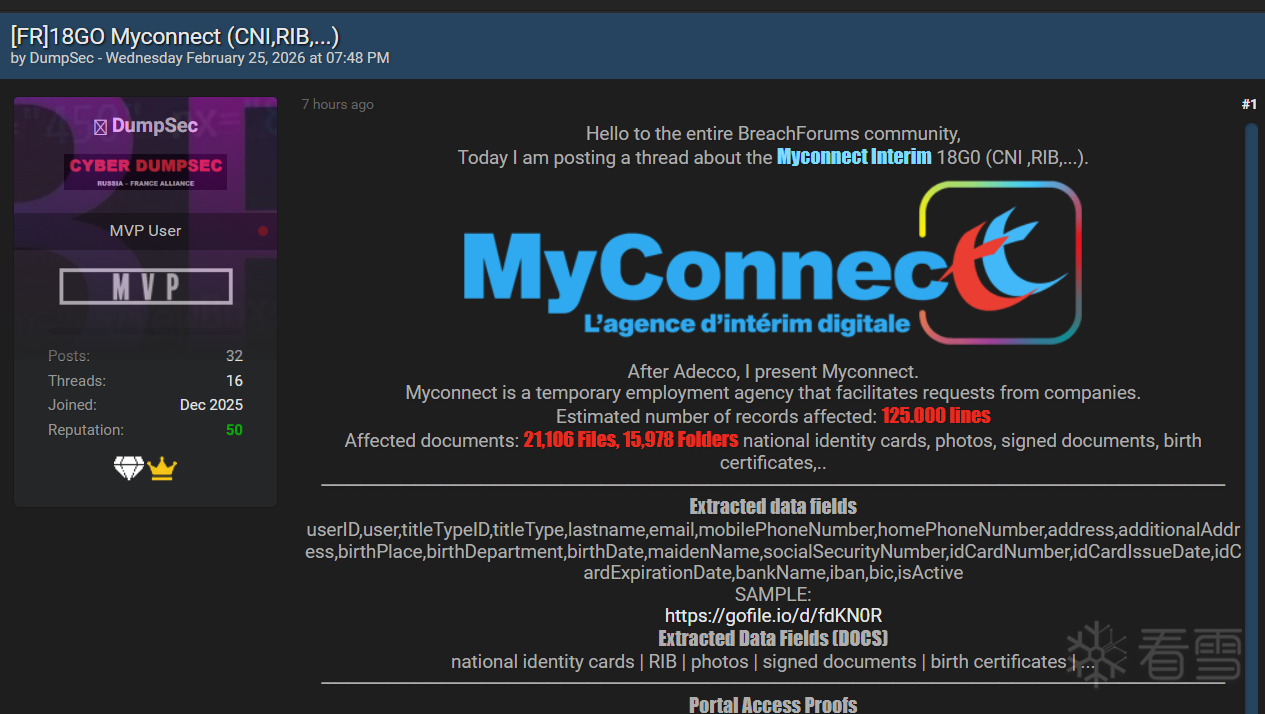 黑客在BreachForums论坛上发帖,声称窃取了法国临时职业介绍所Myconnect的数据并公开售卖。泄露的数据涉及约12.5万条记录,包含大量敏感个人信息,具体包括:用户ID、姓名、电子邮件、手机号码、家庭电话、地址、出生地、出生日期、婚前姓名、社会安全号码、身份证号码、身份证签发及有效期、银行名称、IBAN、BIC等字段。此外,泄露的文件还包括国民身份证、银行账户信息(RIB)、照片、签名文件、出生证明等文档。