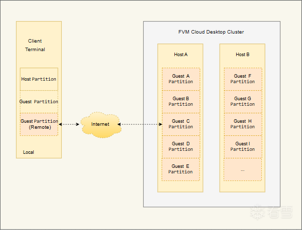 • 云桌面虚拟应用: 在一台宿主机上虚拟多个共享桌面分区环境,供多个FVM客户分区同时远程连接和操作。
