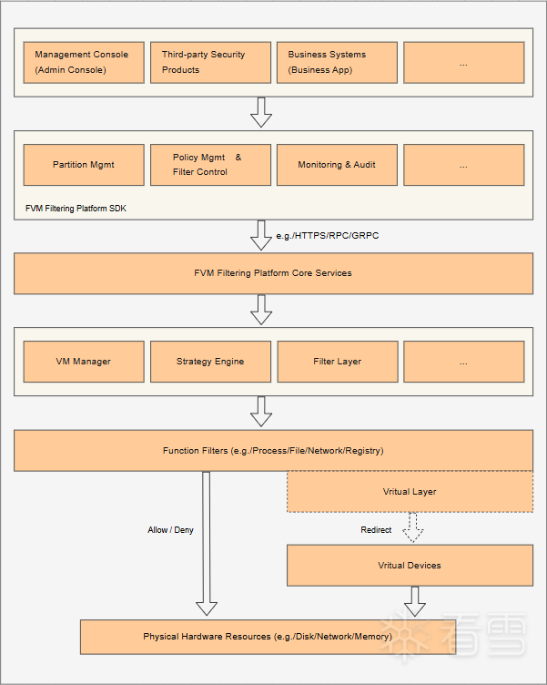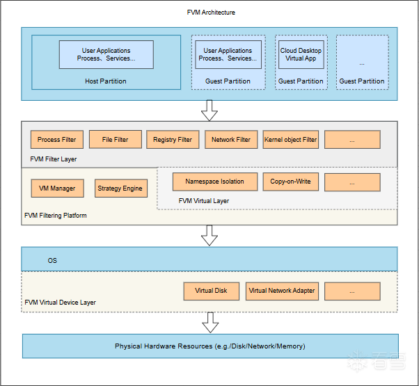 FVM 筛选平台是管控各分区应用程序访问系统资源的处理平台,由筛选层、虚拟机管理器、策略引擎和虚拟层组成。