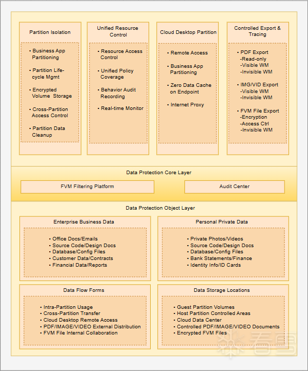 • 办公终端数据保护:在办公终端上通过客户分区访问业务系统,业务数据与个人环境隔离。当需要将工作文档共享时,通过PDF格式导出,接收方仅能查看无法修改或复制。当将文件进行内部协作时,通过FVM文件格式 导出,仅授权分区能够解密打开。当需要访问互联网查阅资料时,通过云桌面代理进行,所有流量经过云端安全检查,终端本地无需直接连接互联网,减少攻击面。