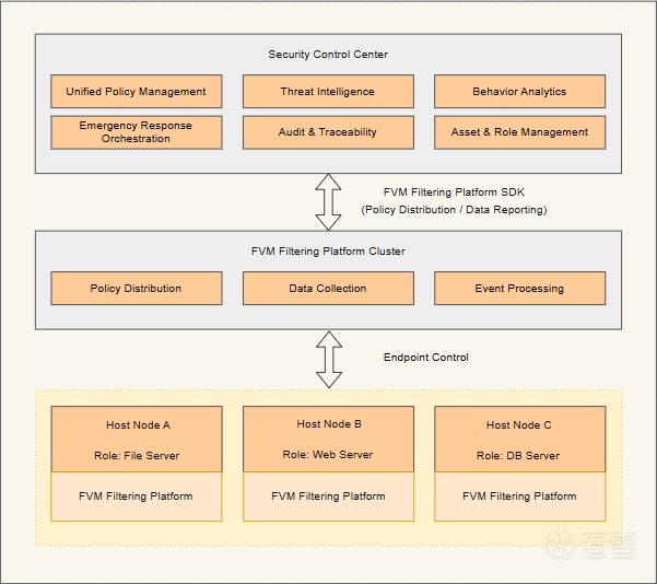 • 三层防护架构:上层安全管控中心为决策中枢,中层管控集群为神经传导系统,下层主机节点为执行单元,每台主机运行完整的FVM筛选平台,包括进程、文件、网络、注册表等各类筛选器。