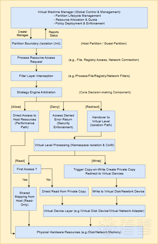 • 仲裁层:策略引擎基于分区标识、资源类型、安全策略及实时状态进行多维评估,输出明确的处置语义——允许(直通宿主)、拒绝(终止访问并返回错误)或重定向(移交虚拟层处理)。