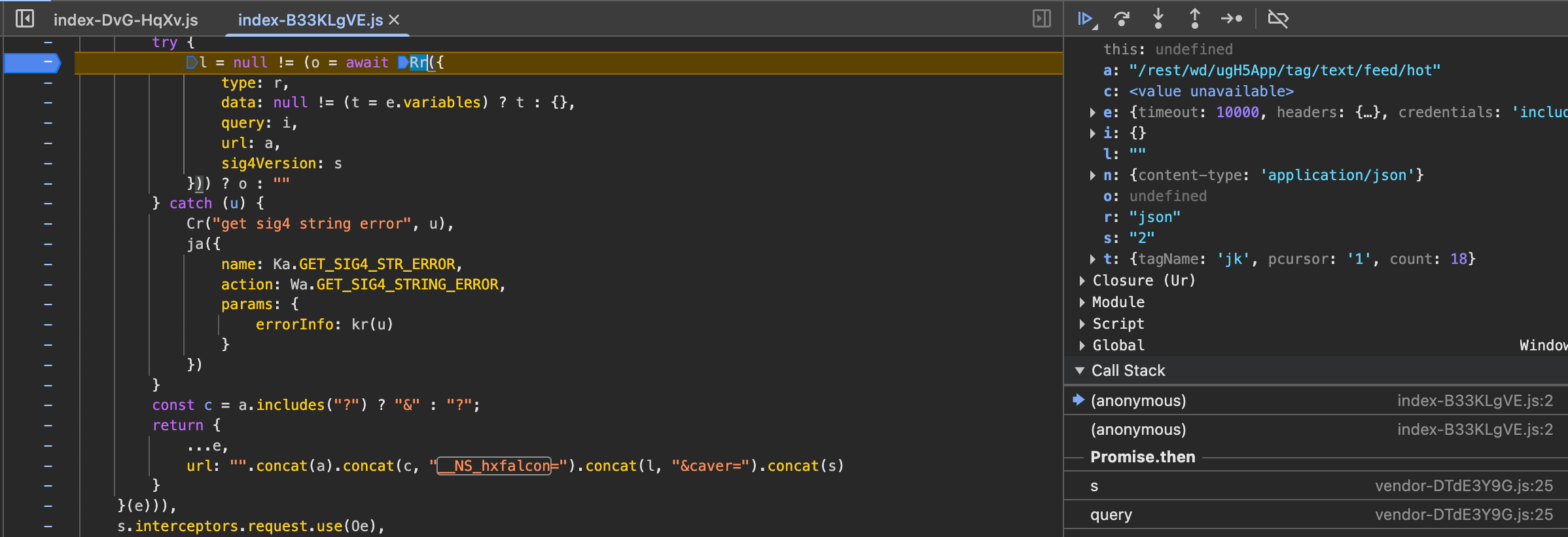 首先是参数定位,搜索关键词“NS_hxfalcon”,然后可以发现有两个js包含这个关键词,不确定是哪一个的话可以都打上断点。可以发现“l”就是__NS_hxfalcon,而“l”来自于“Rr”的返回。