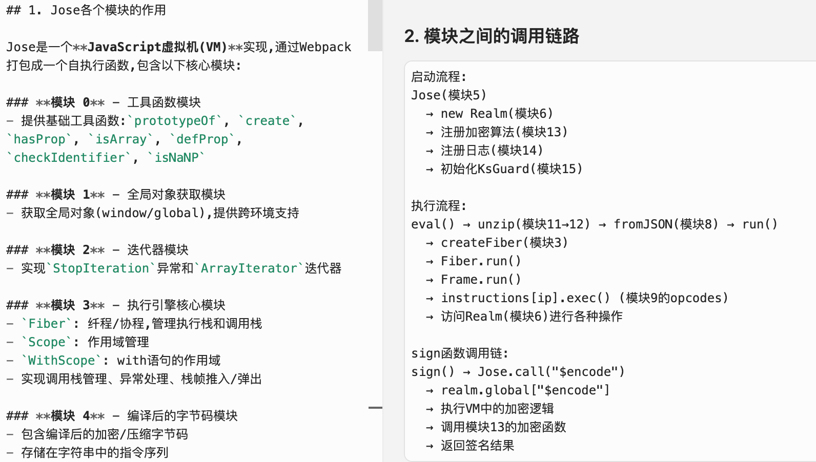下面我们尝试用AI分析一下这个Jose。每个模块的作用分别是什么?模块之间的调用链路是什么?哪些位置适合进行插桩?具体的插桩方式看个人习惯,文件替换、控制台注入、手动插桩等方式都可以让AI给出对应的方案。这里我选择手动插桩。