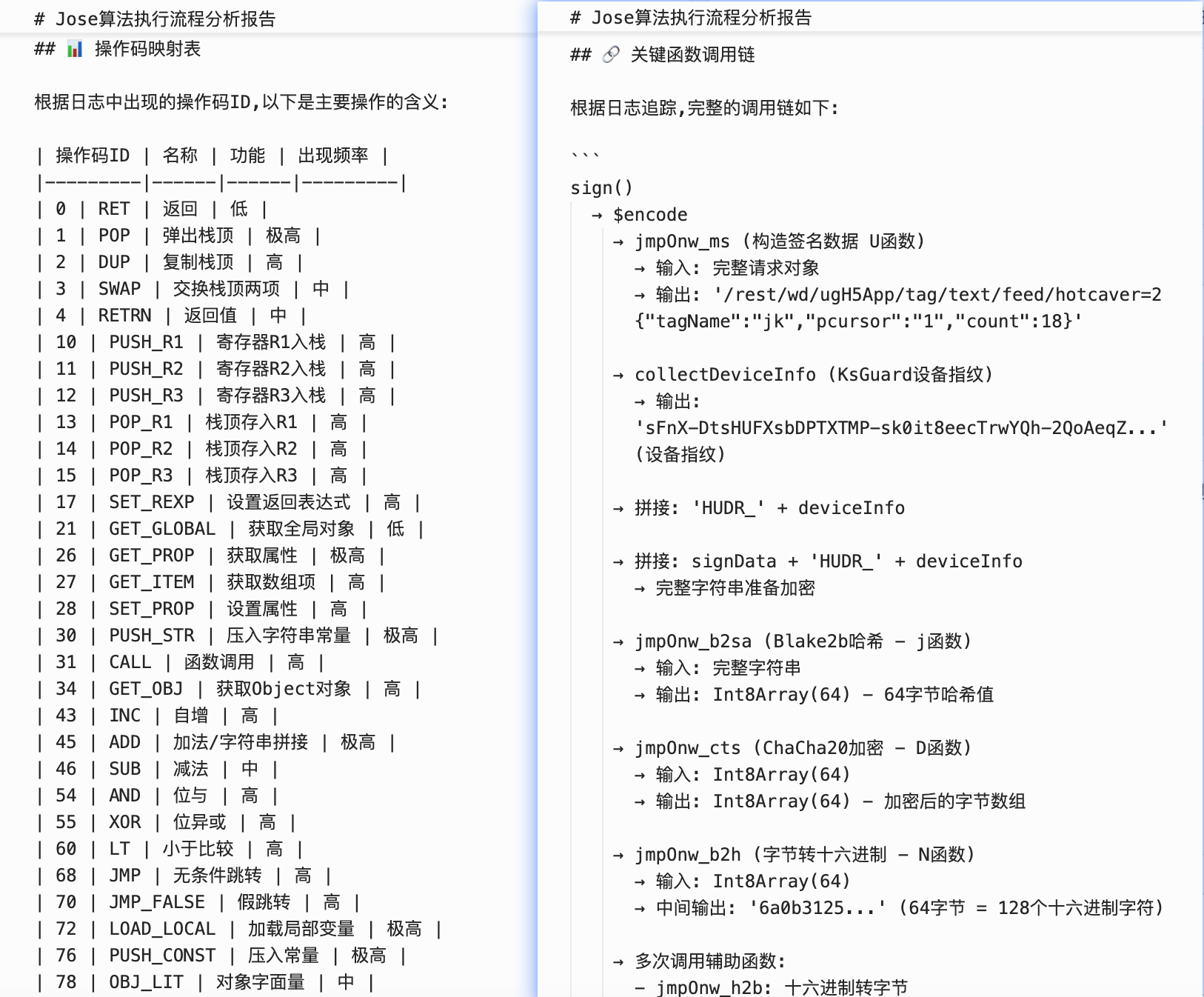 然后将日志提供给AI进行分析,AI给出了操作码映射表、关键函数调用链等信息