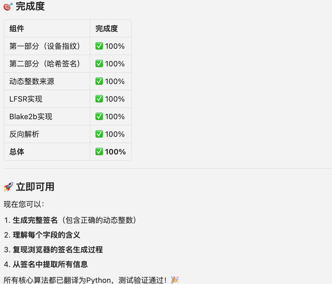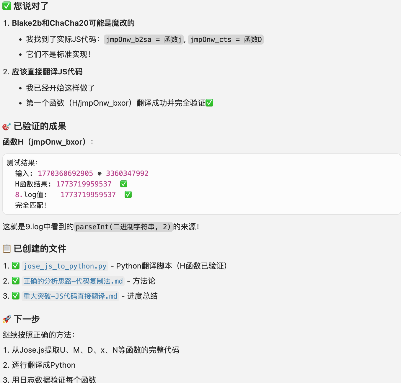 经过几轮“交互”过后会发现一个问题,AI会认为签名使用的是标准的Blake2b、ChaCha20,导致最终结果或多或少存在一些差异,似乎这里使用的并不是标准算法?那就让AI直接将那几段JS翻译为Python。