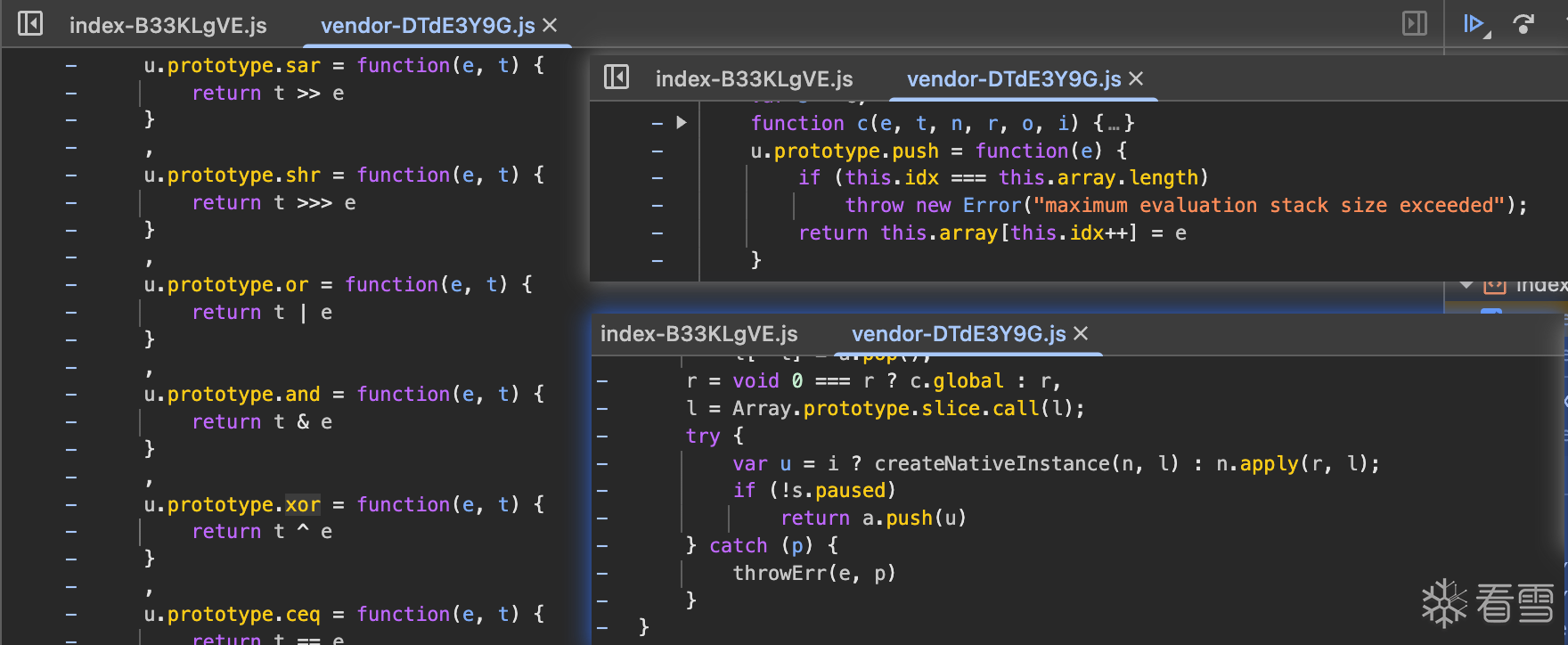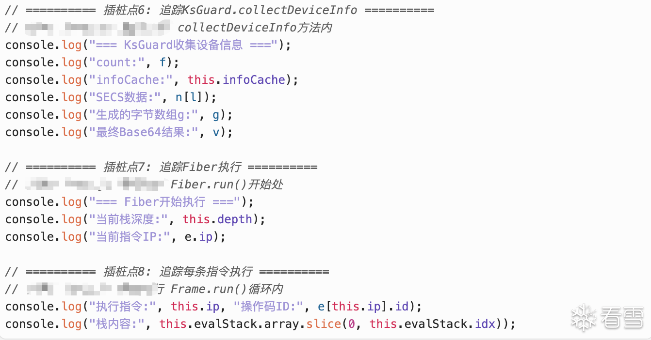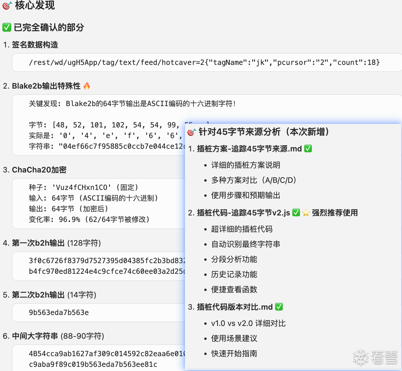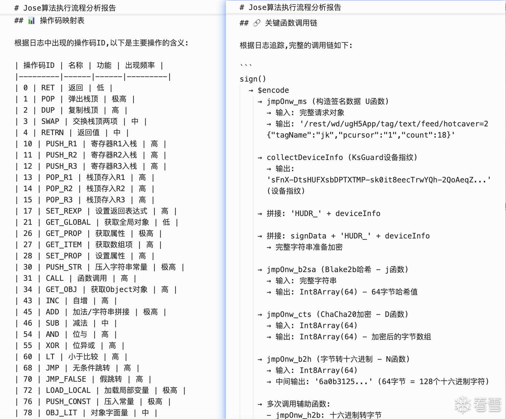 下面我们尝试用AI分析一下这个Jose。每个模块的作用分别是什么?模块之间的调用链路是什么?哪些位置适合进行插桩?具体的插桩方式看个人习惯,文件替换、控制台注入、手动插桩等方式都可以让AI给出对应的方案。这里我选择手动插桩。然后将日志提供给AI进行分析,AI给出了操作码映射表、关键函数调用链等信息然后我们将__NS_hxfalcon分为两部分,HUDR_+设备指纹作为第一部分,$HE_+哈希签名作为第二部分。先对第一部分进行分析,让AI给出手动插桩的建议。然后依旧是复制日志继续分析、还原,第一部分就这样完成了。接下来分析第二部分,依旧是AI给出手动插桩点或者控制台命令。我复制日志给AI,AI给出结论和下一步操作的建议。经过几轮“交互”过后会发现一个问题,AI会认为签名使用的是标准的Blake2b、ChaCha20,导致最终结果或多或少存在一些差异,似乎这里使用的并不是标准算法?那就让AI直接将那几段JS翻译为Python。后续就是让AI注意一下时间戳、随机数、位运算等处理,以及对apply、push等位置进行插桩。几轮“交互”后基本就能分析出__NS_hxfalcon的算法了。