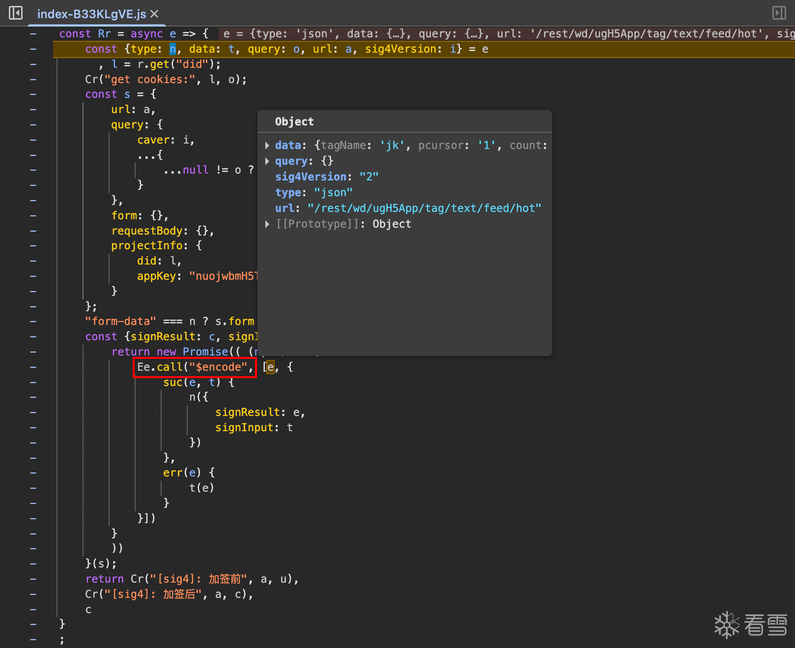 首先是参数定位,搜索关键词“NS_hxfalcon”,然后可以发现有两个js包含这个关键词,不确定是哪一个的话可以都打上断点。可以发现“l”就是__NS_hxfalcon,而“l”来自于“Rr”的返回。进入Rr可以看到前面拼接了一个json对象,然后调用Ee.call的$encode。然后跟进Ee.call可以发现在一个webpack里面,也就是在Jose里面。将整个Jose复制下来,里面有16个模块,简单补一下环境接可以出结果了,然后验证一下可以正常请求。