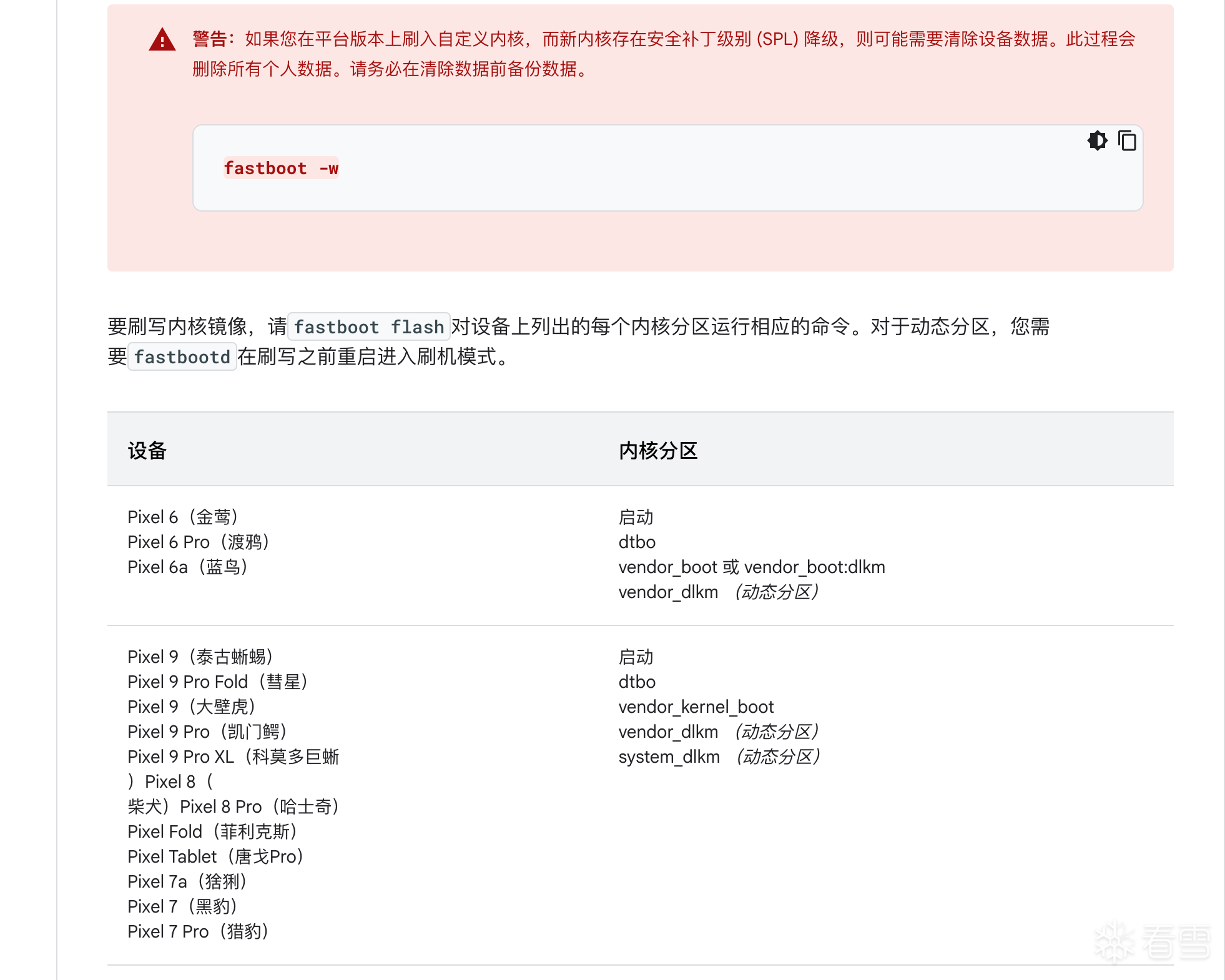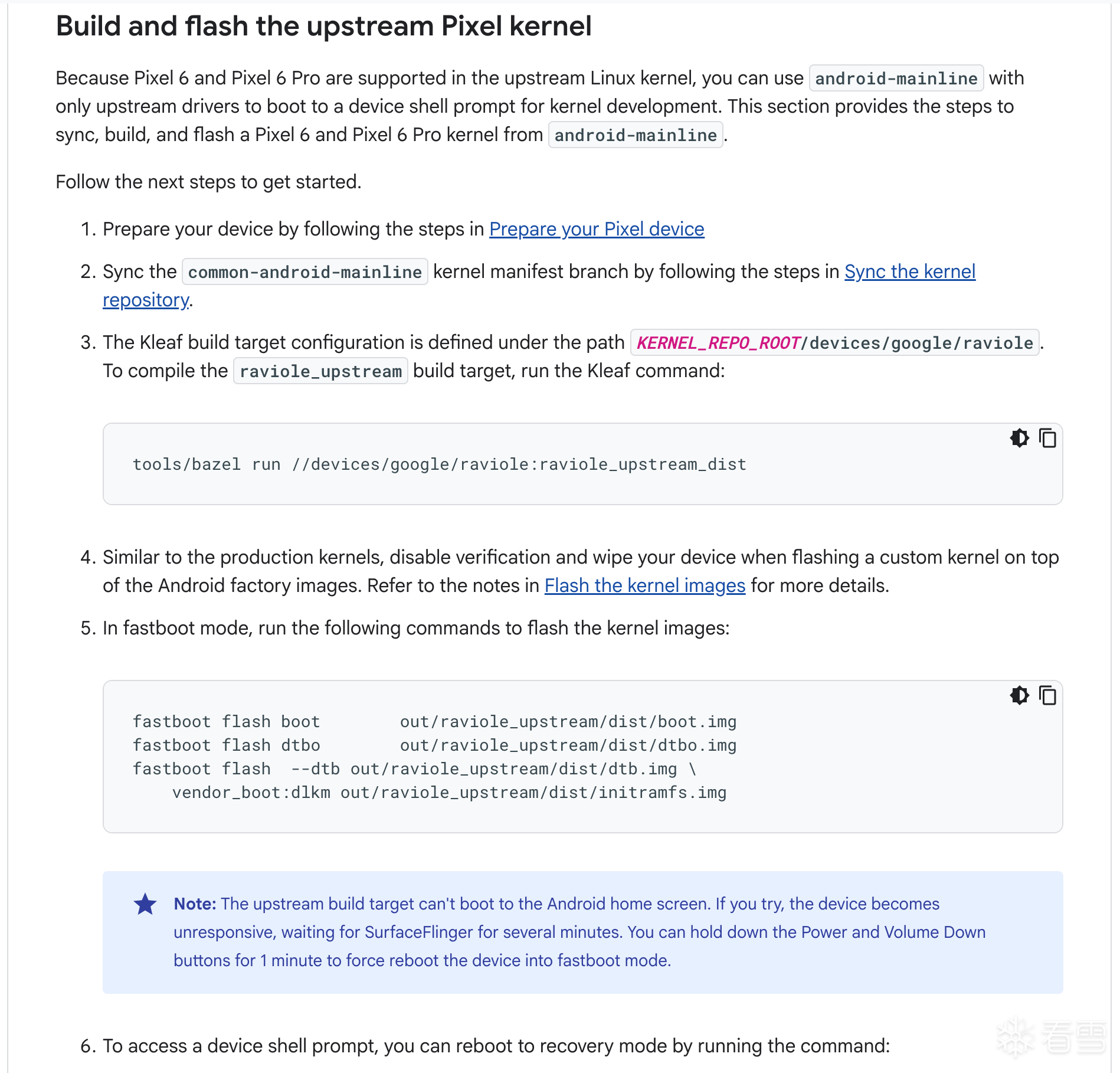 需要注意的是这是设备内核而不是通用内核,需要刷入多个镜像文件,如下图安卓官网所示: