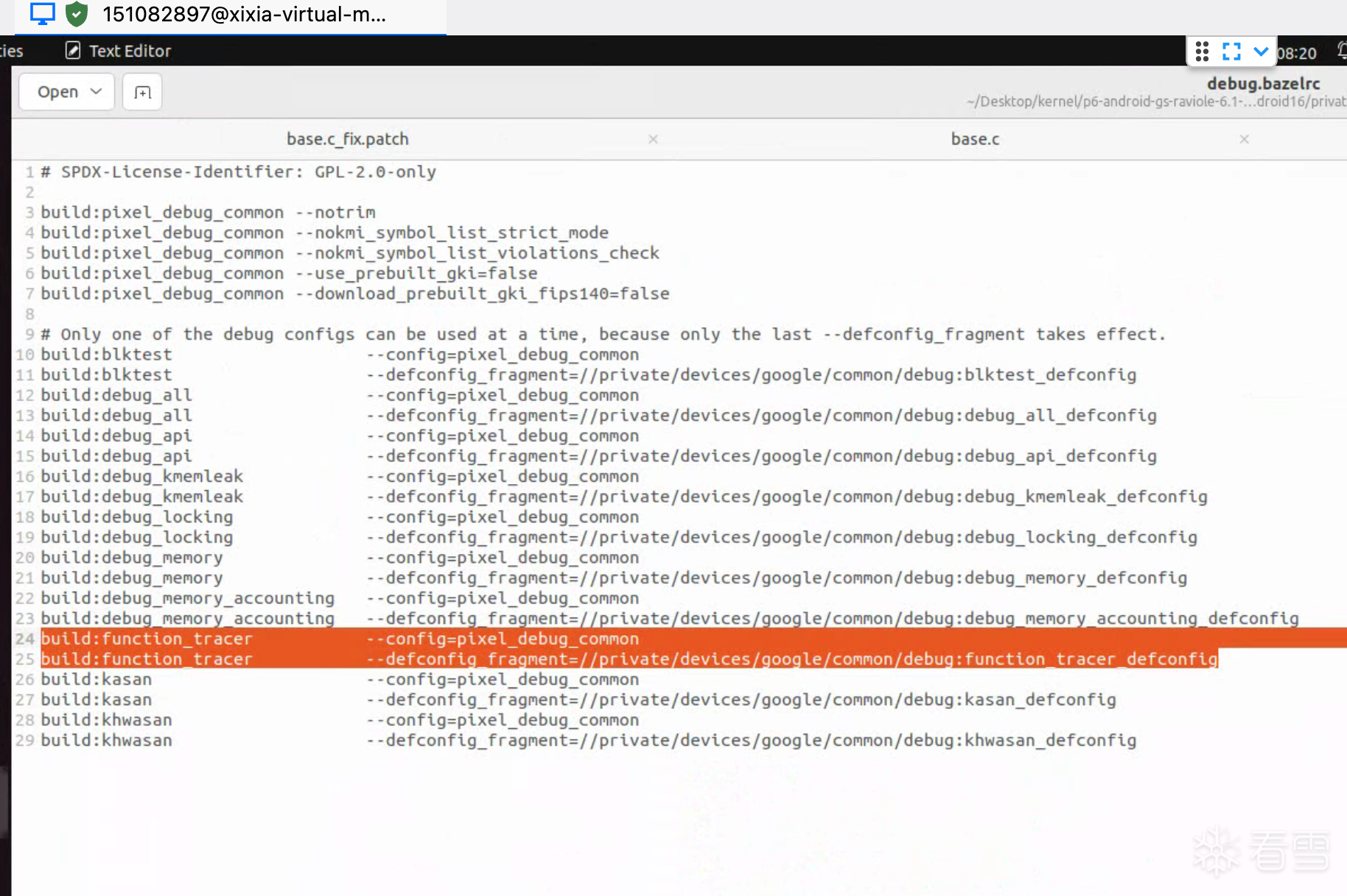 但使用--config=pixel_debug_common参数进行编译生成后内核时还是使用了联网下载的预制内核,所以可以查看该参数来源的private/devices/google/common/debug/debug.bazelrc文件,一看一下就破案了,需要使用的参数为--config=function_tracer,如下图所示: