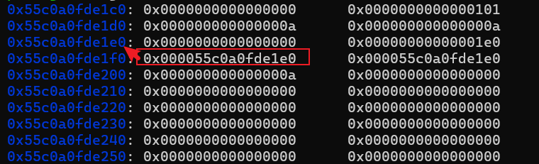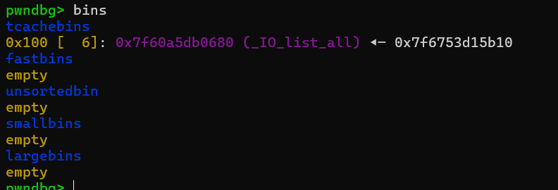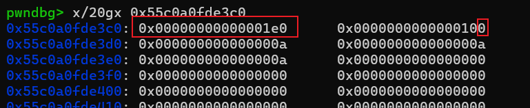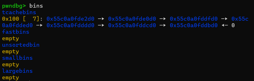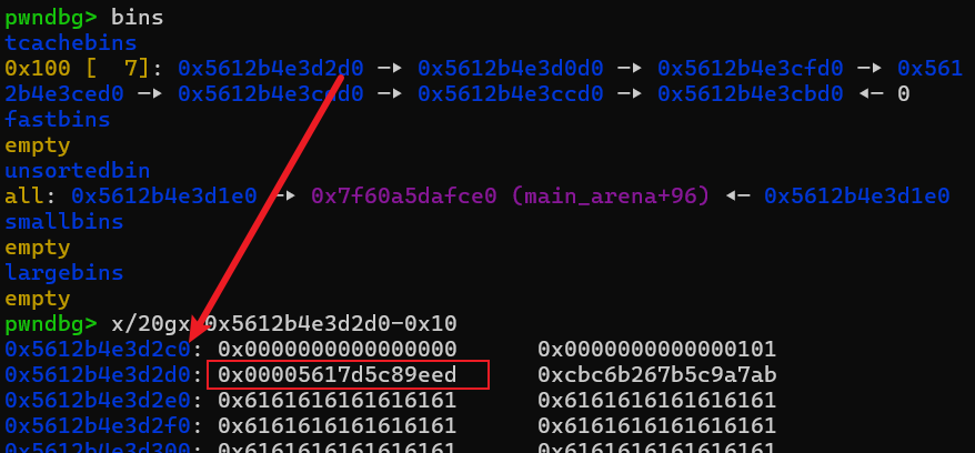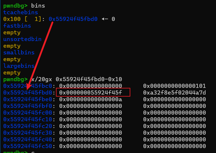 我们free一个size为0x100的chunk,可以看到这个chunk加密后的next指针是0x000000055924f45f。还是看e->next =((&e->next) >> 12 ) ^ tcache -> entries[tc_idx]这个代码,首先&e->next就是next指针的地址,也就是0x55924f45fbd0,再就是tcache -> entries[tc_idx],在我们free之前,这个tcachebin是空的,所以就是0了,也就是变成了e->next =((&e->next) >> 12 ) ^ tcache -> entries[tc_idx] = (0x55924f45fbd0 >> 12) ^ 0 = 0x55924f45f。这对应第一种情况。