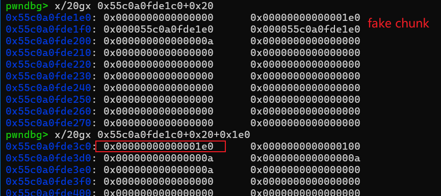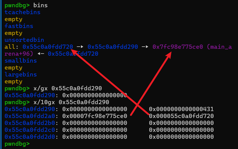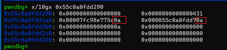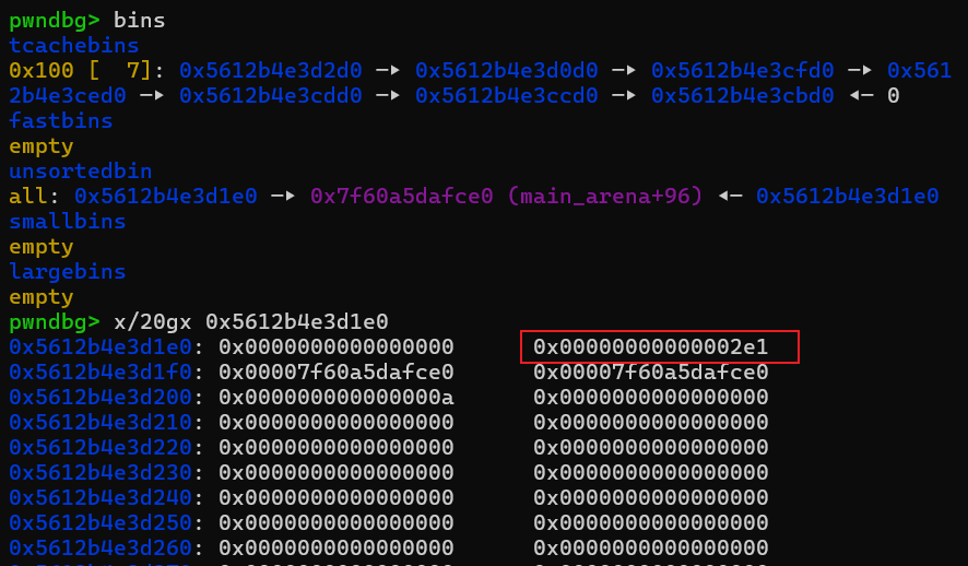 big chunk放入了unsortedbin中,size为0x2e0,因为不是同一次调试,地址不一样了。。凑合着看吧