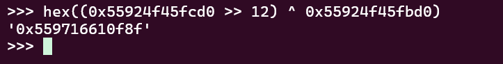 e->next = (&tcache -> entries[tc_idx] >> 12) ^ tcache -> entries[tc_idx] = (0x55924f45fcd0 >> 12) ^ 0x559716610f8f = 0x55924f45fbd0