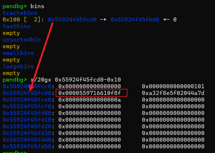 接着我们再free一个同样是size为0x100的chunk,首先&e->next就是next指针的地址,也就是0x55924f45fcd0,再就是tcache -> entries[tc_idx],在我们free之前,这个tcachebin是有一个chunk的,指向的是0x55924f45fbd0,也就是变成了e->next =((&e->next) >> 12 ) ^ tcache -> entries[tc_idx] = (0x55924f45fcd0 >> 12) ^ 0x55924f45fbd0 =0x559716610f8f 。