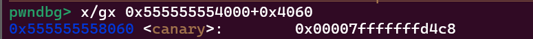 把断点打在设置canary之后,查看canary的值,存着栈地址