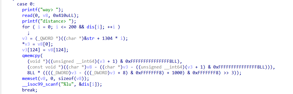 接着在while循环里用了个switch,对应四种功能,首先看case 0,因为v8[128]的空间是0x3e8,跟rbp的距离是0x3FA,而read(0, v8, 0x410uLL);则会导致栈溢出,溢出长度是0x28,可以覆盖到返回地址+0x6的位置。注意memset(v8, 0, sizeof(v8));会清空v8的内容。
