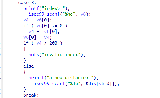 这个函数用来打印dis对应索引的值,要求索引值是正数。但这里存在个问题LOWORD(v0) = -v2;首先%hd输入的是两个字节,v2是用补码表示的,-v2则是将v2做取反运算再+1。