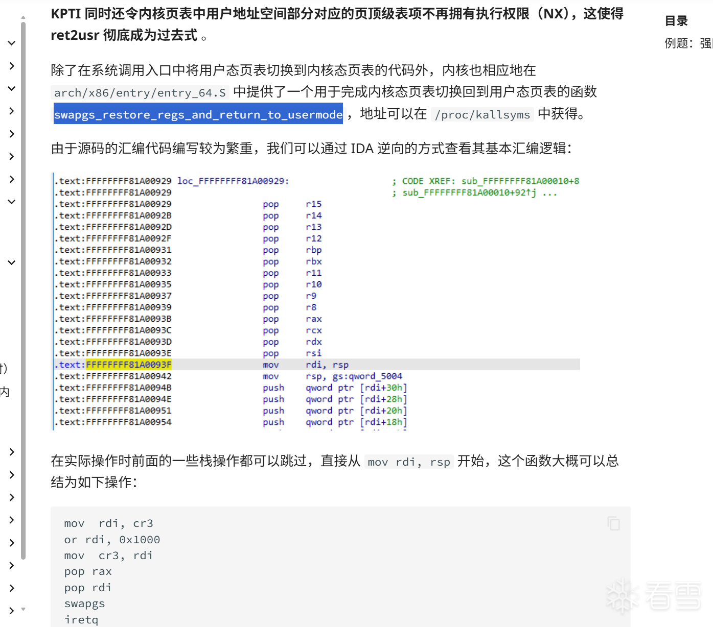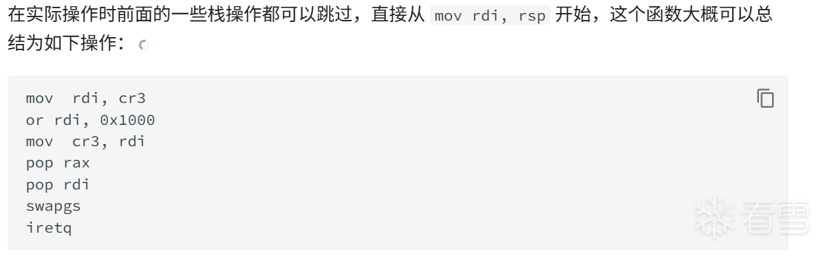 ctf-wiki和一众大佬的博客中,都说可以借助swapgs_restore_regs_and_return_to_usermode来置位CR3,从而绕过KPTI。