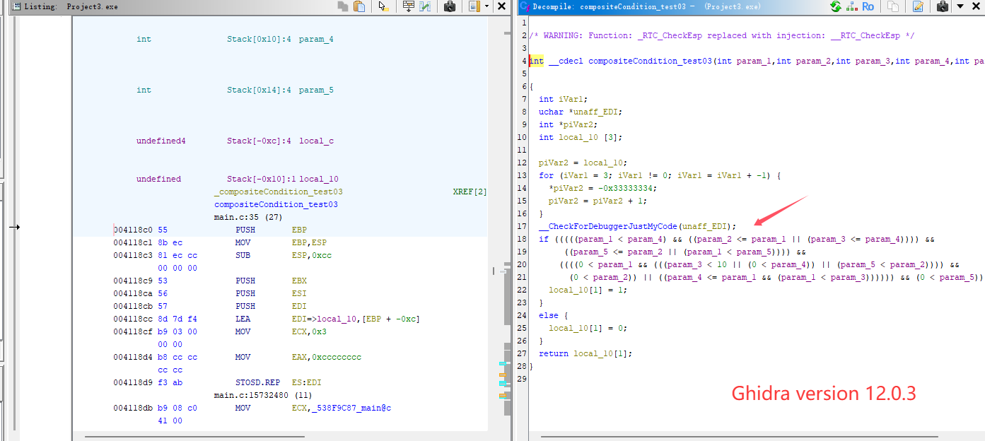 • Ghidra:条件表达式中存在较多冗余括号,且局部变量被错误聚合为数组(如 int local_10[3]),虽不影响正确性,但降低可读性。