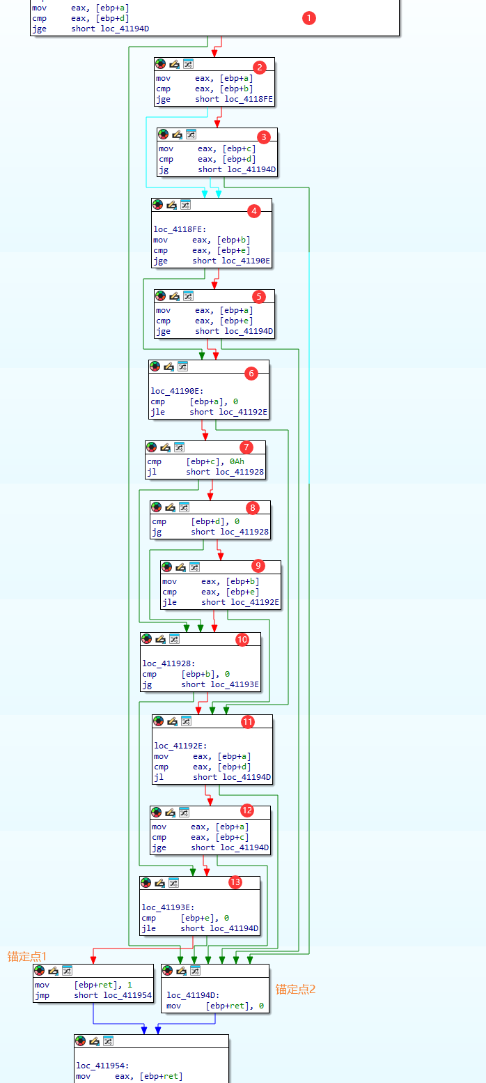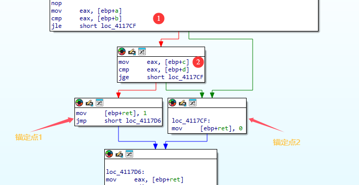 节点①跳转至锚定点2,因此“不跳”表示条件为真,即 a > b;节点②为尾部条件节点,亦不跳,即 c < d;逻辑运算符为 &&,最终还原为:a > b && c < d