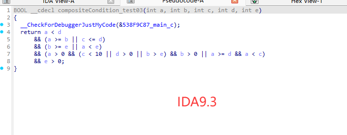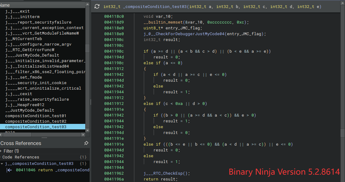 以示例3的 compositeCondition_test03函数为例,对比 IDA、Binary Ninja、Ghidra 的反编译结果: