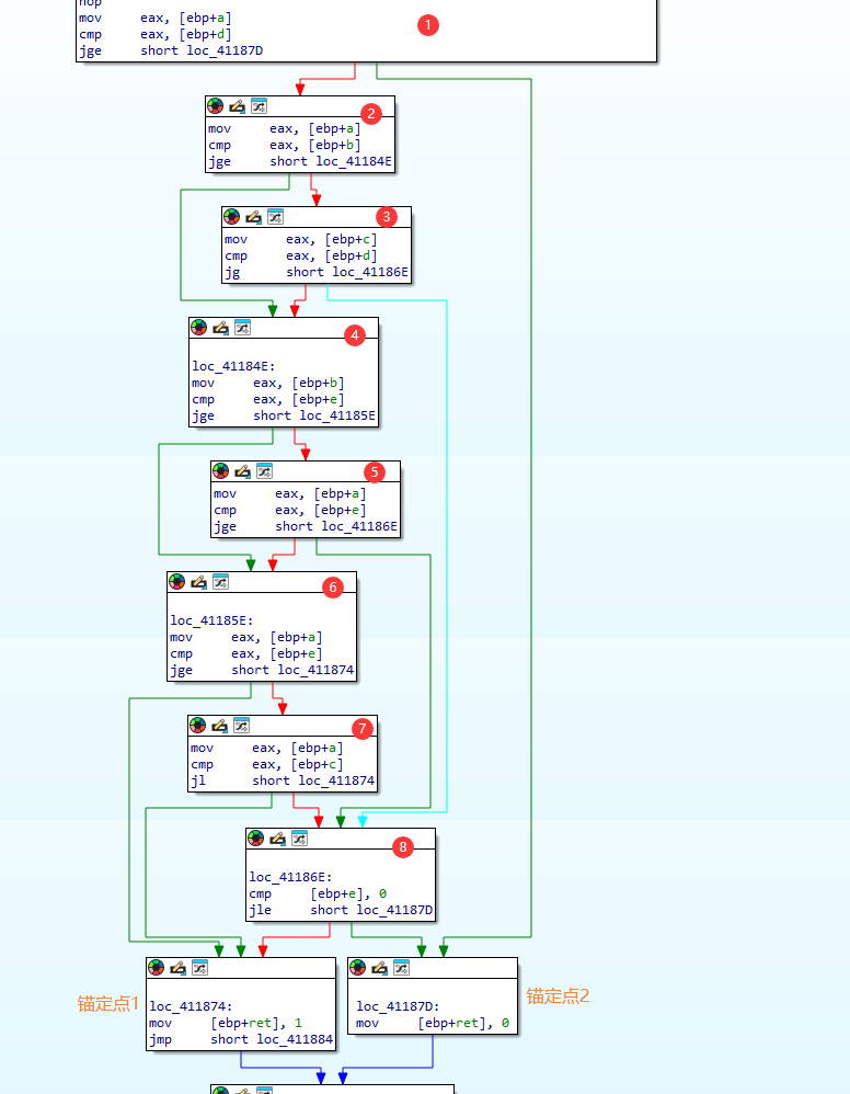• 节点⑥最终到达锚定点1,路径为奇数 → 条件语句跳转,对应 a >= e,逻辑运算符为 ||