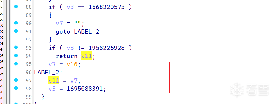 此时的v12 = 1,所以这里v3被赋值成0xEA4F3F0B,接着就重新进行while循环,此时v3满足了while ( v3 > (int)0xCF812BC6 ),则进入循环,此时会进入到这个else分支: