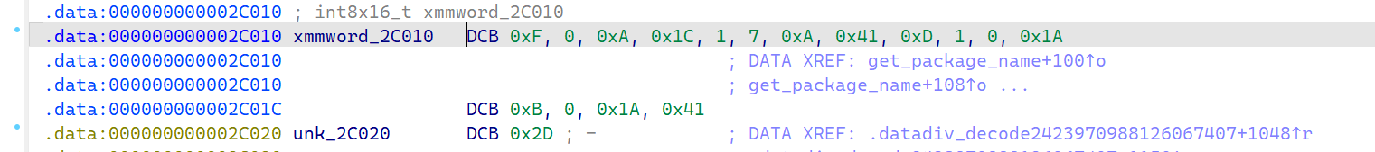 可以看到做的操作就是获取JNI的方法ID,方便后续调用。可以看到这里的本该传入的字符串好像都是被加密的,点击xmmword_2C010进入看看情况: