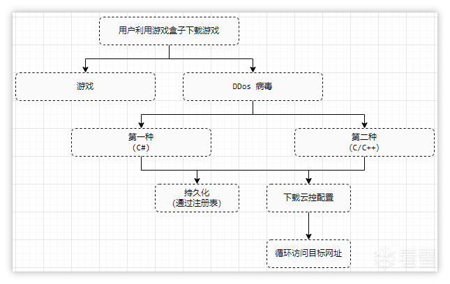 流程说明:用户下载游戏盒子后会下载游戏或者工具,此时该程序会捆绑下载DDos病毒,随后该 DDos 病毒会主动获取云控配置并解密解析,其配置中包含需要攻击的目标IP或网址,随后利用循环的方式进行访问,其中会通过修改注册表达到持久化的目的。